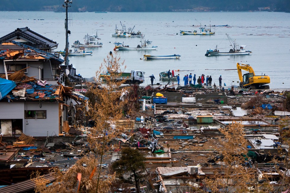 小さな人間の力とショベルカーと小船・・・力を合わせて少しずつ復興への道へ進み始める。
