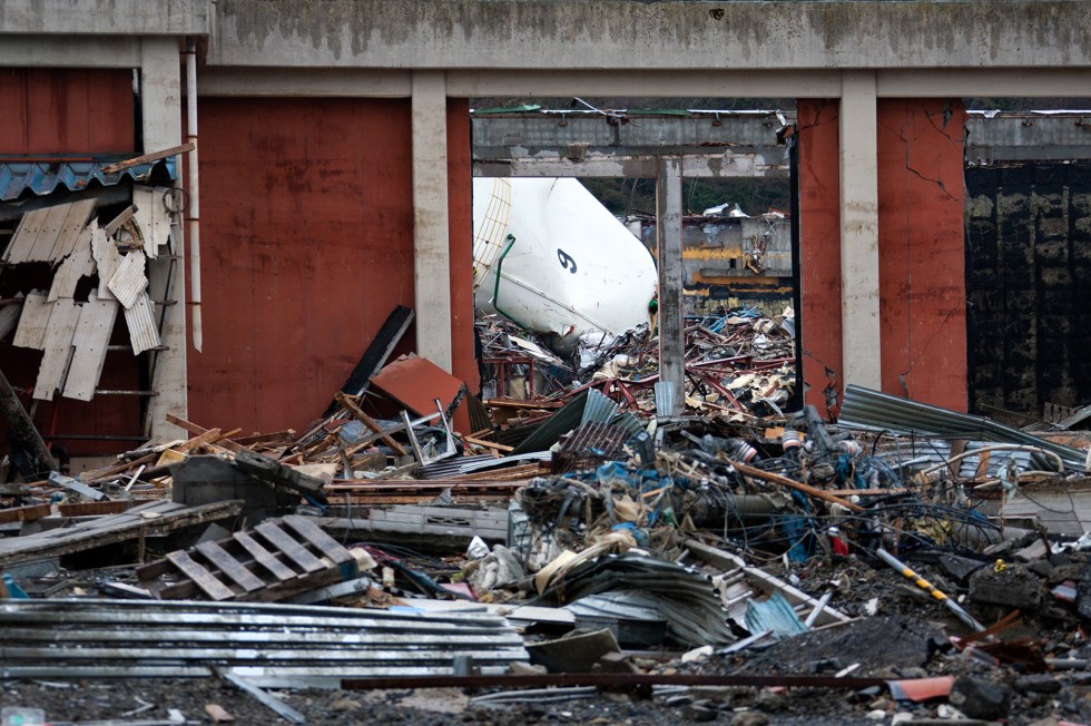 崩れ落ちた建物の向こう側には巨大な重油タンクが転がっていた。