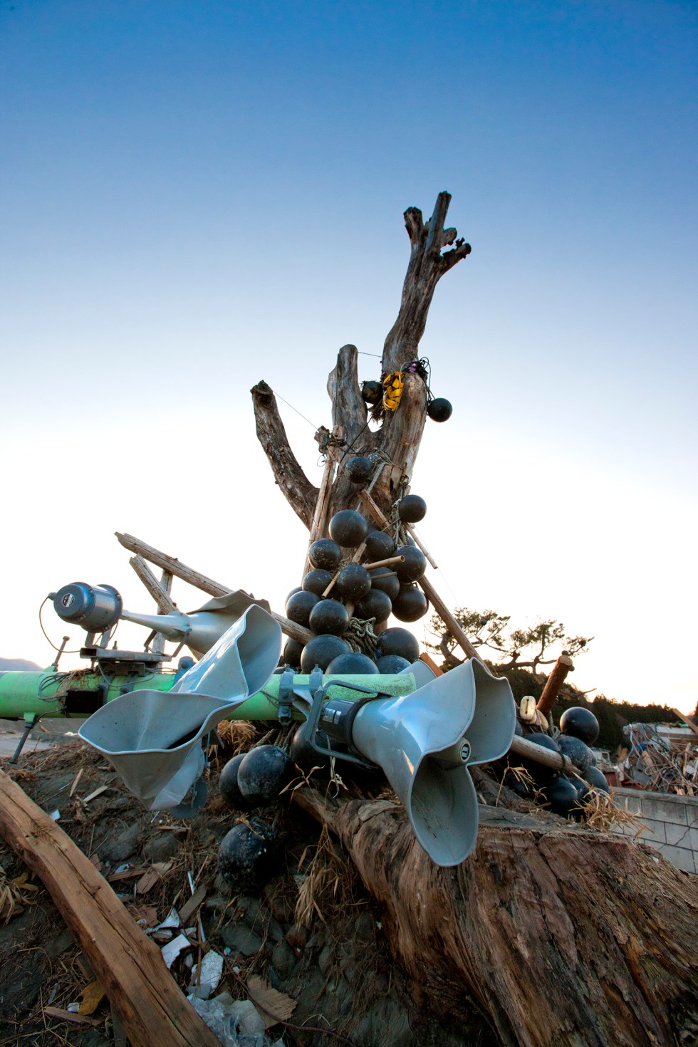 防災スピーカーや浮き、漁網などが絡みつき、まるでオブジェと化した一本の立ち木が天を指差していた。